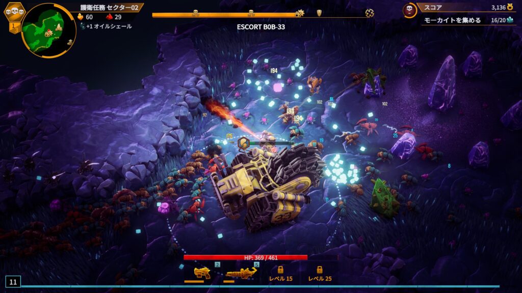 DRG本編とは異なり、本作ではゲーム中に明確なレベルアップ要素が存在する。敵を倒したり鉱床を崩したりすると経験値のオーブが出現し、それを集めることでレベルアップする。レベルが上がるたびに、武器性能の強化や新武器の追加、能力強化などが書かれた3枚のカードが提示され、その中から1つを選択する形式だ。このシステムはバンサバ系ではお馴染みで、どの強化を積み重ねるかによってビルドが大きく変化する。