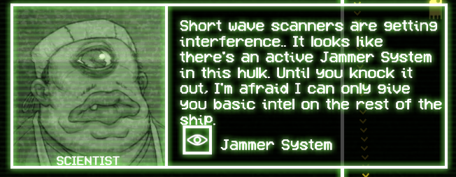 [科学者] 短波スキャナーに干渉が発生している。この残骸には、稼働中のジャマー・システムがあるようだ。それを無力化するまでは、艦内の他の部分については基本的な情報しか提供できない。