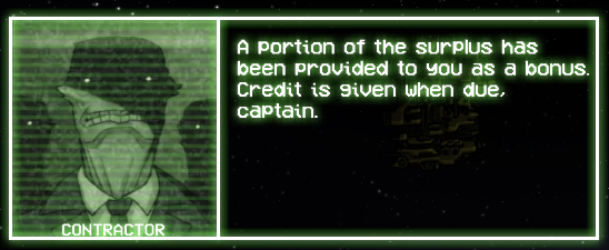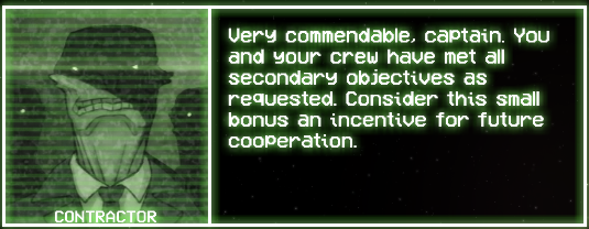 [契約者] 実に見事だ、艦長。あなたと乗組員は、要求されたすべての副次目標を達成した。このささやかなボーナスを、今後の協力に向けたインセンティブと受け取ってほしい。