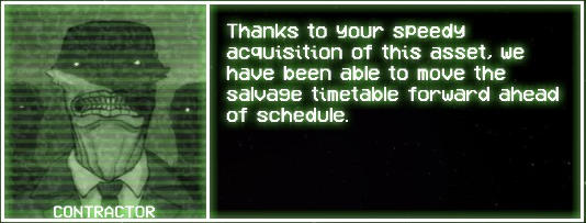 [契約者] この資産を迅速に確保してくれたおかげで、サルベージの予定を当初の計画より前倒しすることができた。