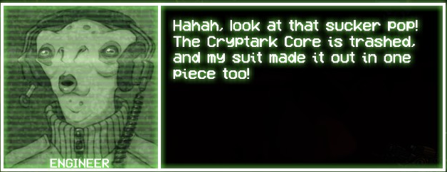 [エンジニア] ははっ、見ろよ、派手に吹き飛んだな!クリプトアーク・コアは完全に破壊、しかも俺のスーツは無傷だ!