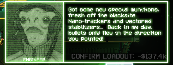 [エンジニア] ブラックサイトから直送の、新しい特殊弾薬が入ったぞ…… ナノ・トラッカーに、ベクター式スタビライザーだ…… 昔はな、弾は狙った方向にしか飛ばなかったもんだ!