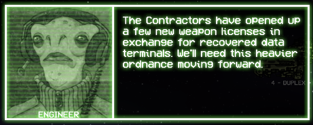 [エンジニア] 回収したデータ端末と引き換えに、請負業者がいくつかの新しい武器ライセンスを開放した。今後は、より重武装が必要になるだろう。